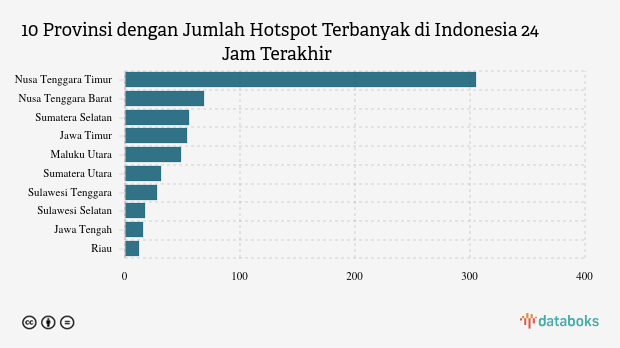 Titik panas terdeteksi paling banyak berada di Nusa Tenggara Timur sebanyak 305 titik. Nusa Tenggara Barat menempati posisi kedua jumlah titik panas terbanyak dengan 69 titik. Sumatera Selatan berada di posisi ketiga sebanyak 56 titik panas.