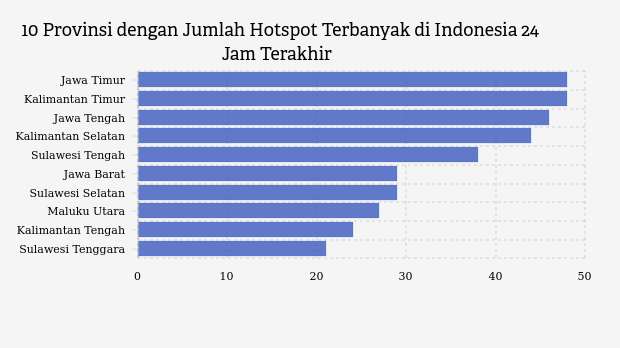 Titik panas terdeteksi paling banyak berada di Jawa Timur sebanyak 48 titik. Kalimantan Timur menempati posisi kedua jumlah titik panas terbanyak dengan 48 titik. Jawa Tengah berada di posisi ketiga sebanyak 46 titik panas.