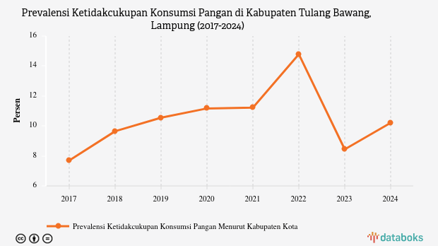 Merujuk data Badan Pusat Statistik (BPS), prevalensi ketidakcukupan pangan (Prevalence of Undernourishment/PoU) di Kabupaten Tulang Bawang, Lampung mencapai 10,21% pada 2024.