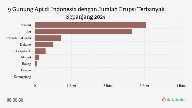 Selama tahun 2025, MAGMA Indonesia telah merekam 7.371 letusan/erupsi gunung api di seluruh Indonesia. Gunung Semeru di Jawa Timur paling banyak erupsi (3.037 kali letusan) sedangkan Gunung Ibu erupsi 2.665 kali.