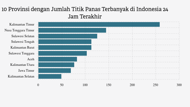 Titik panas terdeteksi paling banyak berada di Kalimantan Timur sebanyak 258 titik. Nusa Tenggara Timur menempati posisi kedua jumlah titik panas terbanyak dengan 144 titik. Sulawesi Selatan berada di posisi ketiga sebanyak 125 titik panas.