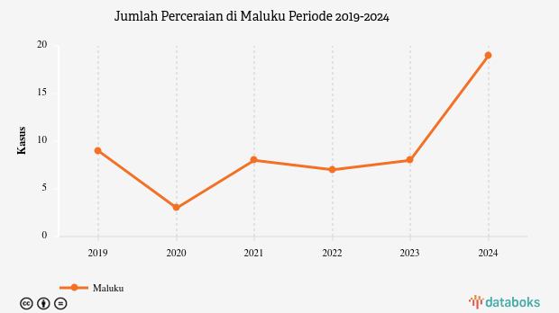 Jumlah perceraian di Maluku tercatat 19 kasus data per 2024. Angka ini bertambah dibanding 2023 dan lebih tinggi dibanding Desember 2022. Selama lima tahun terakhir, rata-rata pertumbuhan tahunan (CAGR) yakni di angka 44,65%.