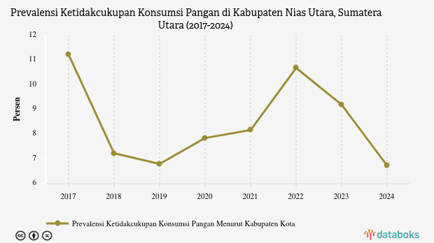 Badan Pusat Statistik (BPS) melaporkan, prevalensi ketidakcukupan pangan (Prevalence of Undernourishment/PoU) di Kabupaten Nias Utara, Sumatera Utara mencapai 6,73% pada 2024.