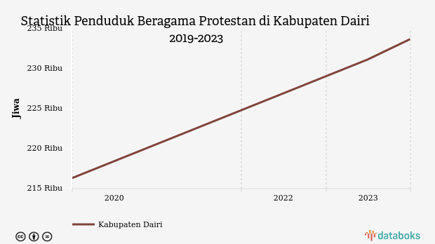 Penduduk beragama Protestan di Kabupaten Dairi, data per 31 Desember 2023 tercatat 233,72 ribu jiwa.
