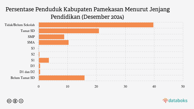 Sementara itu, ada 15,87% penduduk Kabupaten Pamekasan yang belum tamat SD. Adapun penduduk yang tidak/belum sekolah sejumlah 39,73%.