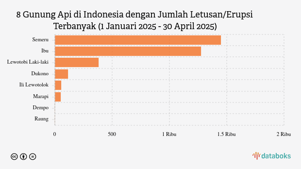 Selama tahun 2025, MAGMA Indonesia telah merekam 3.329 letusan/erupsi gunung api di seluruh Indonesia. Gunung Semeru di Jawa Timur paling banyak erupsi (1.448 kali letusan) sedangkan Gunung Ibu erupsi 1.277 kali.
