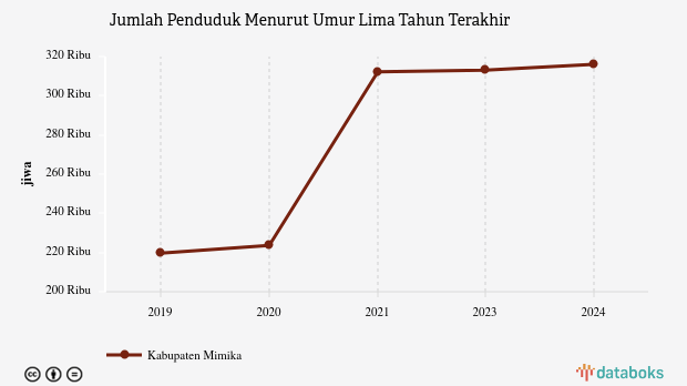 Jumlah penduduk di Kabupaten Mimika tercatat 316 ribu jiwa data per 2024. Angka ini dalam 22 tahun berturut-turut terus naik. Selama lima tahun terakhir, rata-rata pertumbuhan tahunan (CAGR) jumlah penduduk di wilayah ini sebesar 7,54%. Pertumbuhan ini lebih tinggi dibandingkan dengan pertumbuhan lima tahun sebelumnya yang tercatat 1,57%.