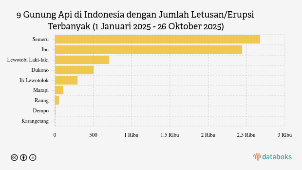 Selama tahun 2025, MAGMA Indonesia telah merekam 6.778 letusan/erupsi gunung api di seluruh Indonesia. Gunung Semeru di Jawa Timur paling banyak erupsi dengan 2.678 kali letusan.