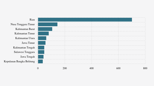 Titik panas terdeteksi paling banyak berada di Riau sebanyak 700 titik. Nusa Tenggara Timur menempati posisi kedua jumlah titik panas terbanyak dengan 145 titik. Kalimantan Barat berada di posisi ketiga sebanyak 106 titik panas.