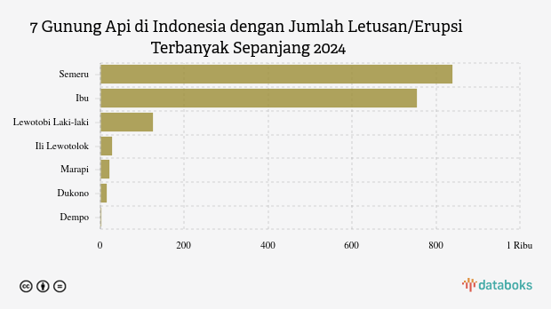 Selama tahun 2025, MAGMA Indonesia telah merekam 1.786 letusan/erupsi gunung api di seluruh Indonesia. Gunung Semeru di Jawa Timur paling banyak erupsi (840 kali letusan) sedangkan Gunung Ibu erupsi 755 kali.