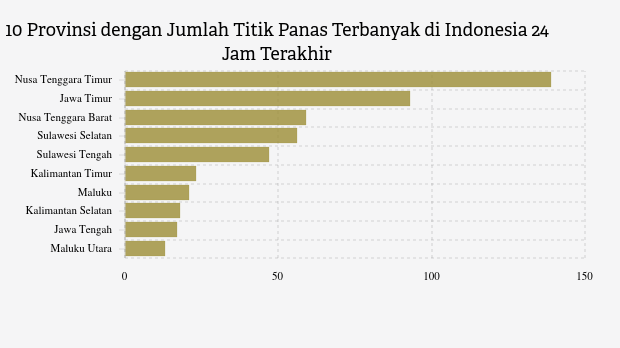 Titik panas terdeteksi paling banyak berada di Nusa Tenggara Timur sebanyak 139 titik. Jawa Timur menempati posisi kedua jumlah titik panas terbanyak dengan 93 titik. Nusa Tenggara Barat berada di posisi ketiga sebanyak 59 titik panas.
