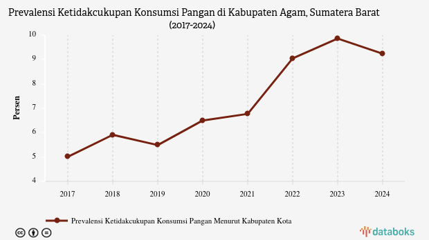 Badan Pusat Statistik (BPS) melaporkan, prevalensi ketidakcukupan pangan (Prevalence of Undernourishment/PoU) di Kabupaten Agam, Sumatera Barat sebesar 9,24% pada 2024.