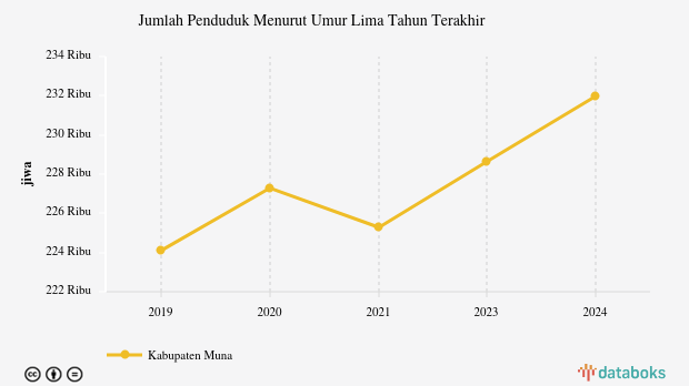 Jumlah penduduk di Kabupaten Muna tercatat 231,98 ribu jiwa data per 2024. Angka ini bertambah dibanding 2023 dan lebih tinggi dibanding Desember 2021. Selama lima tahun terakhir, rata-rata pertumbuhan tahunan (CAGR) jumlah penduduk di wilayah ini sebesar 0,69%. Pertumbuhan ini lebih rendah dibandingkan dengan pertumbuhan lima tahun sebelumnya yang tercatat 1,16%.