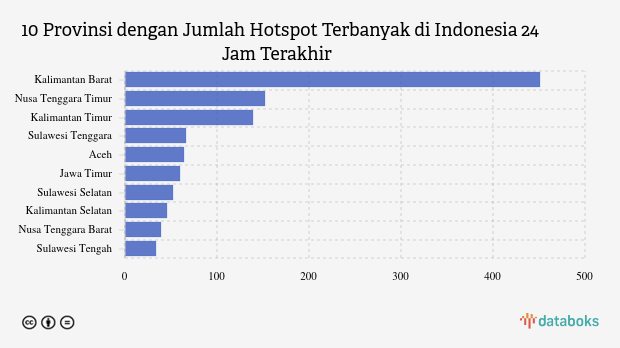 Titik panas terdeteksi paling banyak berada di Kalimantan Barat sebanyak 451 titik. Nusa Tenggara Timur menempati posisi kedua jumlah titik panas terbanyak dengan 152 titik. Kalimantan Timur berada di posisi ketiga sebanyak 139 titik panas.
