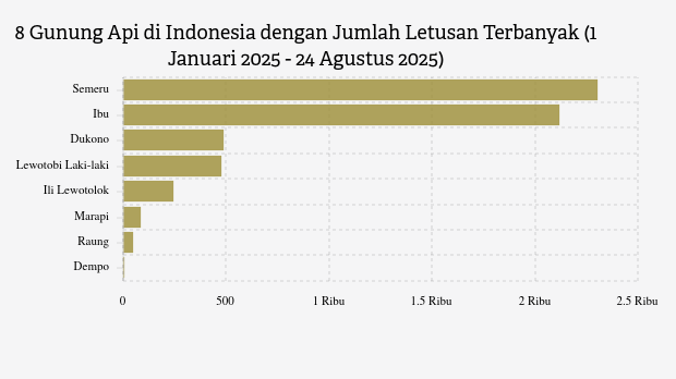 Selama tahun 2025, MAGMA Indonesia telah merekam 5.769 letusan/erupsi gunung api di seluruh Indonesia. Gunung Semeru di Jawa Timur paling banyak erupsi (2.305 kali letusan) sedangkan Gunung Lewotobi Laki-laki erupsi 478 kali.