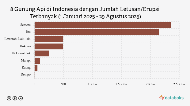 Selama tahun 2025, MAGMA Indonesia telah merekam 5.870 letusan/erupsi gunung api di seluruh Indonesia. Gunung Semeru di Jawa Timur paling banyak erupsi (2.351 kali letusan) sedangkan Gunung Marapi erupsi 91 kali.