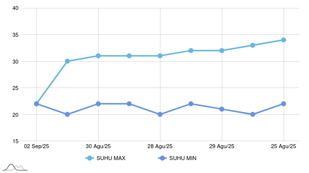 Untuk suhu di Kota Sawahlunto, tertinggi terjadi pada tanggal Senin, 25 Agustus 2025 dengan suhu 34 °C dan terendah yakni 20°C yang terjadi pada Selasa, 26 Agustus 2025. Berikut ini detail cuaca harian seminggu ke depan di kota Kota Sawahlunto :