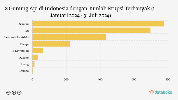 Selama tahun 2024, MAGMA Indonesia telah merekam 2.238 letusan/erupsi gunung api di seluruh Indonesia. Gunung Semeru di Jawa Timur paling banyak erupsi (776 kali letusan) sedangkan Gunung Lewotobi Laki-laki erupsi 433 kali.