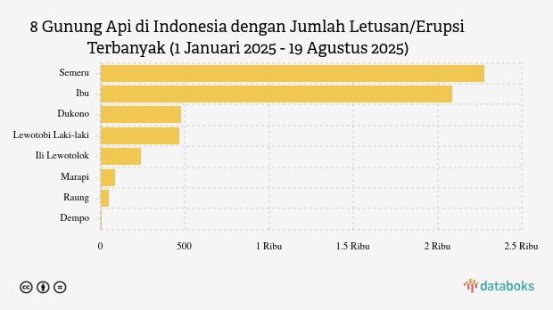 Selama tahun 2025, MAGMA Indonesia telah merekam 5.691 letusan/erupsi gunung api di seluruh Indonesia. Gunung Semeru di Jawa Timur paling banyak erupsi dengan 2.280 kali letusan.