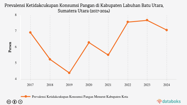 Badan Pusat Statistik (BPS) melaporkan, prevalensi ketidakcukupan pangan (Prevalence of Undernourishment/PoU) di Kabupaten Labuhan Batu Utara, Sumatera Utara sebesar 7,08% pada 2024.