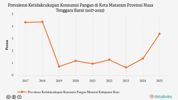 Merujuk data Badan Pusat Statistik (BPS), prevalensi ketidakcukupan pangan (Prevalence of Undernourishment/PoU) di Kota Mataram, Nusa Tenggara Barat mencapai 3,42% pada 2025.