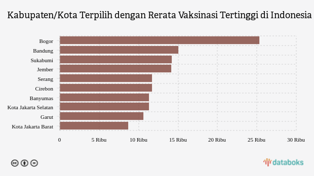 Rerata vaksinasi tiga kabupaten/kota teratas dengan angka di atas 14.000 dosis adalah Bogor, Bandung dan Sukabumi dengan masing-masing nilai 25.291 dosis, 15.027 dosis dan 14.222 dosis.