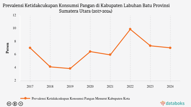 Badan Pusat Statistik (BPS) melaporkan, prevalensi ketidakcukupan pangan (Prevalence of Undernourishment/PoU) di Kabupaten Labuhan Batu, Sumatera Utara sebesar 7,07% pada 2024.