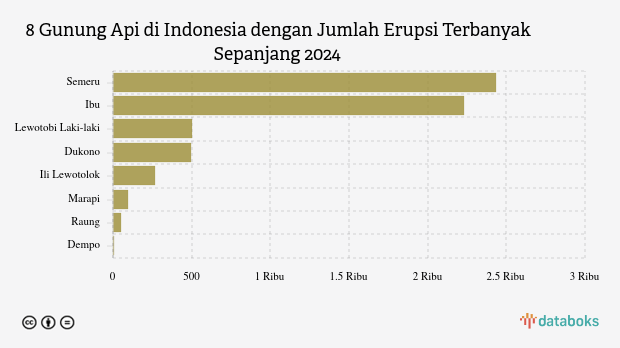 Selama tahun 2025, MAGMA Indonesia telah merekam 6.078 letusan/erupsi gunung api di seluruh Indonesia. Gunung Semeru di Jawa Timur paling banyak erupsi dengan 2.437 kali letusan.