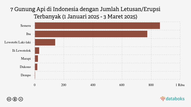 Selama tahun 2025, MAGMA Indonesia telah merekam 1.842 letusan/erupsi gunung api di seluruh Indonesia. Gunung Semeru di Jawa Timur paling banyak erupsi (861 kali letusan) sedangkan Gunung Ibu erupsi 773 kali.