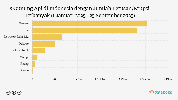 Selama tahun 2025, MAGMA Indonesia telah merekam 6.441 letusan/erupsi gunung api di seluruh Indonesia. Gunung Semeru di Jawa Timur paling banyak erupsi (2.530 kali letusan) sedangkan Gunung Lewotobi Laki-laki erupsi 648 kali.