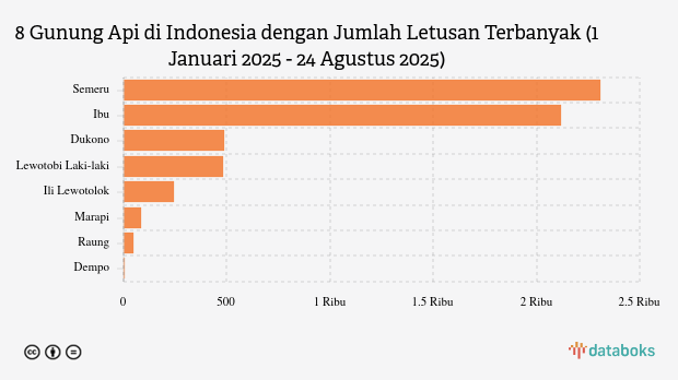 Selama tahun 2025, MAGMA Indonesia telah merekam 5.777 letusan/erupsi gunung api di seluruh Indonesia. Gunung Semeru di Jawa Timur paling banyak erupsi (2.309 kali letusan) sedangkan Gunung Ibu erupsi 2.119 kali.