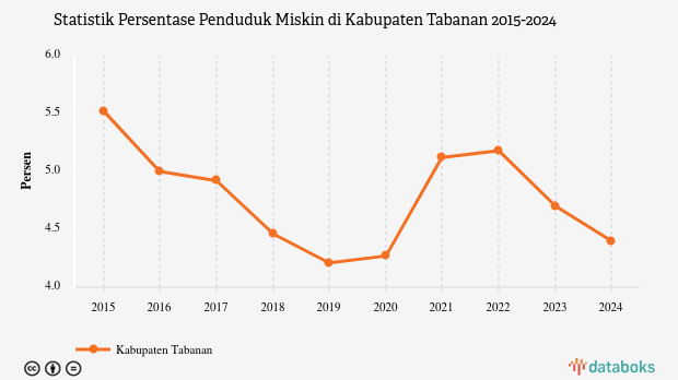Perkembangan persentase penduduk miskin dalam 10 tahun di Kabupaten Tabanan dalam tren turun dari yang semula kemiskinan sebesar 5,52 persen menuju ke 4,4 persen.