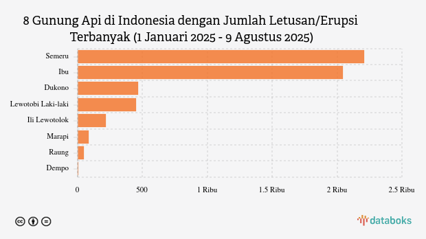 Selama tahun 2025, MAGMA Indonesia telah merekam 5.526 letusan/erupsi gunung api di seluruh Indonesia. Gunung Semeru di Jawa Timur paling banyak erupsi (2.208 kali letusan) sedangkan Gunung Ili Lewotolok erupsi 219 kali.