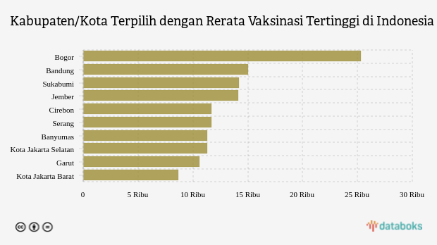 Rerata vaksinasi tiga kabupaten/kota teratas dengan angka di atas 14.000 dosis adalah Bogor, Bandung dan Sukabumi dengan masing-masing nilai 25.291 dosis, 15.027 dosis dan 14.222 dosis.