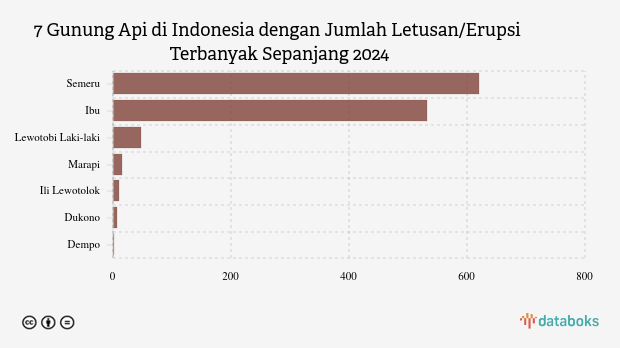 Selama tahun 2025, MAGMA Indonesia telah merekam 1.234 letusan/erupsi gunung api di seluruh Indonesia. Gunung Semeru di Jawa Timur paling banyak erupsi dengan 620 kali letusan.