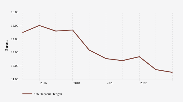 Perkembangan persentase penduduk miskin dalam 10 tahun di Kabupaten Tapanuli Tengah dalam tren turun, bergerak dari kemiskinan sebesar 14,47 persen menuju ke 11,5 persen.