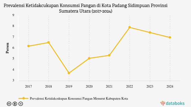 Menurut data Badan Pusat Statistik (BPS), prevalensi ketidakcukupan pangan (Prevalence of Undernourishment/PoU) di Kota Padang Sidimpuan, Sumatera Utara sebesar 6,99% pada 2024.