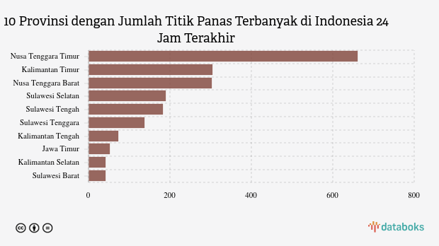 Titik panas terdeteksi paling banyak berada di Nusa Tenggara Timur sebanyak 660 titik. Kalimantan Timur menempati posisi kedua jumlah titik panas terbanyak dengan 304 titik. Nusa Tenggara Barat berada di posisi ketiga sebanyak 303 titik panas.