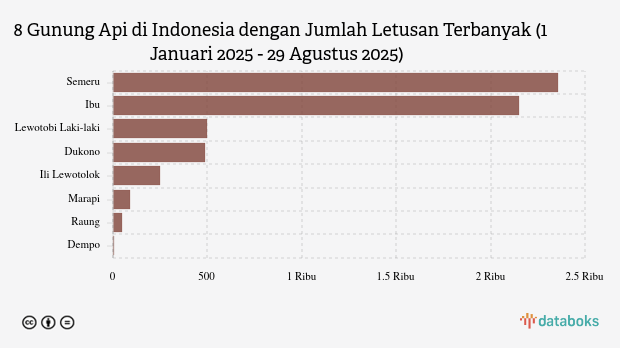Selama tahun 2025, MAGMA Indonesia telah merekam 5.888 letusan/erupsi gunung api di seluruh Indonesia. Gunung Semeru di Jawa Timur paling banyak erupsi (2.358 kali letusan) sedangkan Gunung Ili Lewotolok erupsi 251 kali.