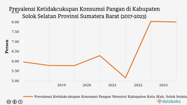 Merujuk data Badan Pusat Statistik (BPS), prevalensi ketidakcukupan pangan (Prevalence of Undernourishment/PoU) di Kabupaten Solok Selatan, Sumatera Barat sebesar 8,01% pada 2023.