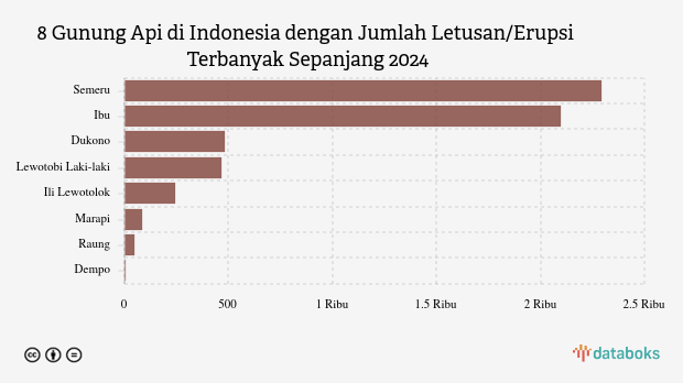 Selama tahun 2025, MAGMA Indonesia telah merekam 5.716 letusan/erupsi gunung api di seluruh Indonesia. Gunung Semeru di Jawa Timur paling banyak erupsi dengan 2.294 kali letusan.