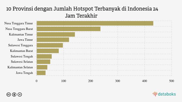 Titik panas terdeteksi paling banyak berada di Nusa Tenggara Timur sebanyak 432 titik. Nusa Tenggara Barat menempati posisi kedua jumlah titik panas terbanyak dengan 236 titik. Kalimantan Timur berada di posisi ketiga sebanyak 141 titik panas.