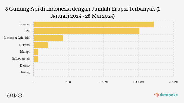 Selama tahun 2025, MAGMA Indonesia telah merekam 3.981 letusan/erupsi gunung api di seluruh Indonesia. Gunung Semeru di Jawa Timur paling banyak erupsi (1.718 kali letusan) sedangkan Gunung Ibu erupsi 1.511 kali.