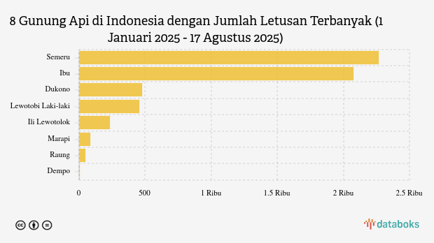 Selama tahun 2025, MAGMA Indonesia telah merekam 5.644 letusan/erupsi gunung api di seluruh Indonesia. Gunung Semeru di Jawa Timur paling banyak erupsi (2.265 kali letusan) sedangkan Gunung Ibu erupsi 2.076 kali.
