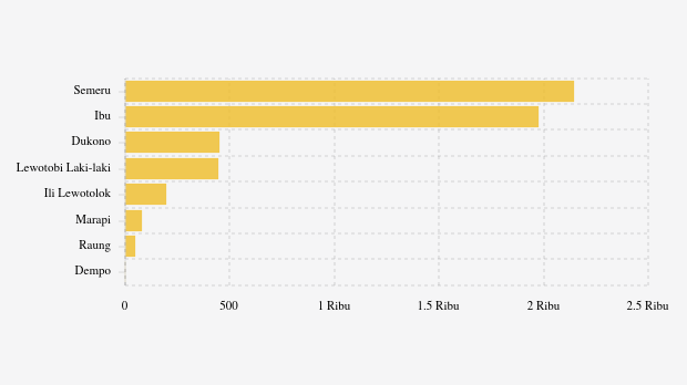 Selama tahun 2025, MAGMA Indonesia telah merekam 5.343 letusan/erupsi gunung api di seluruh Indonesia. Gunung Semeru di Jawa Timur paling banyak erupsi (2.145 kali letusan) sedangkan Gunung Ibu erupsi 1.976 kali.