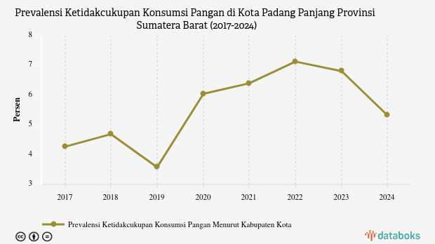 Menurut data Badan Pusat Statistik (BPS), prevalensi ketidakcukupan pangan (Prevalence of Undernourishment/PoU) di Kota Padang Panjang, Sumatera Barat mencapai 5,33% pada 2024.