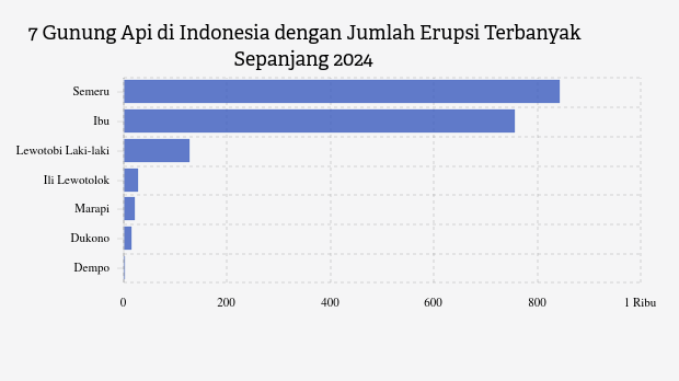 Selama tahun 2025, MAGMA Indonesia telah merekam 1.791 letusan/erupsi gunung api di seluruh Indonesia. Gunung Semeru di Jawa Timur paling banyak erupsi dengan 843 kali letusan.