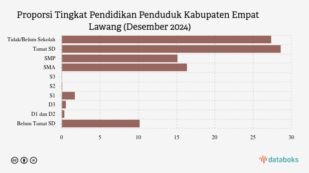 Sementara itu, ada 10,15% penduduk Kabupaten Empat Lawang yang belum tamat SD. Adapun penduduk yang tidak/belum sekolah sejumlah 27,31%.