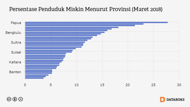 Persentase penduduk miskin Indonesia pada Maret 2018 turun menjadi 9,82% dibanding posisi September 2017 sebesar 10,12% maupun Maret 2017 sebesar 10,64%. Namun, sebanyak 16 provinsi angka kemiskinannya masih di atas 10% dan juga di atas angka kemiskinan nasional. Sisanya, 18 provinsi persentase kemiskinannya di bawah angka kemiskinan nasional.