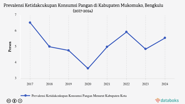 Badan Pusat Statistik (BPS) melaporkan, prevalensi ketidakcukupan pangan (Prevalence of Undernourishment/PoU) di Kabupaten Mukomuko, Bengkulu mencapai 5,56% pada 2024.
